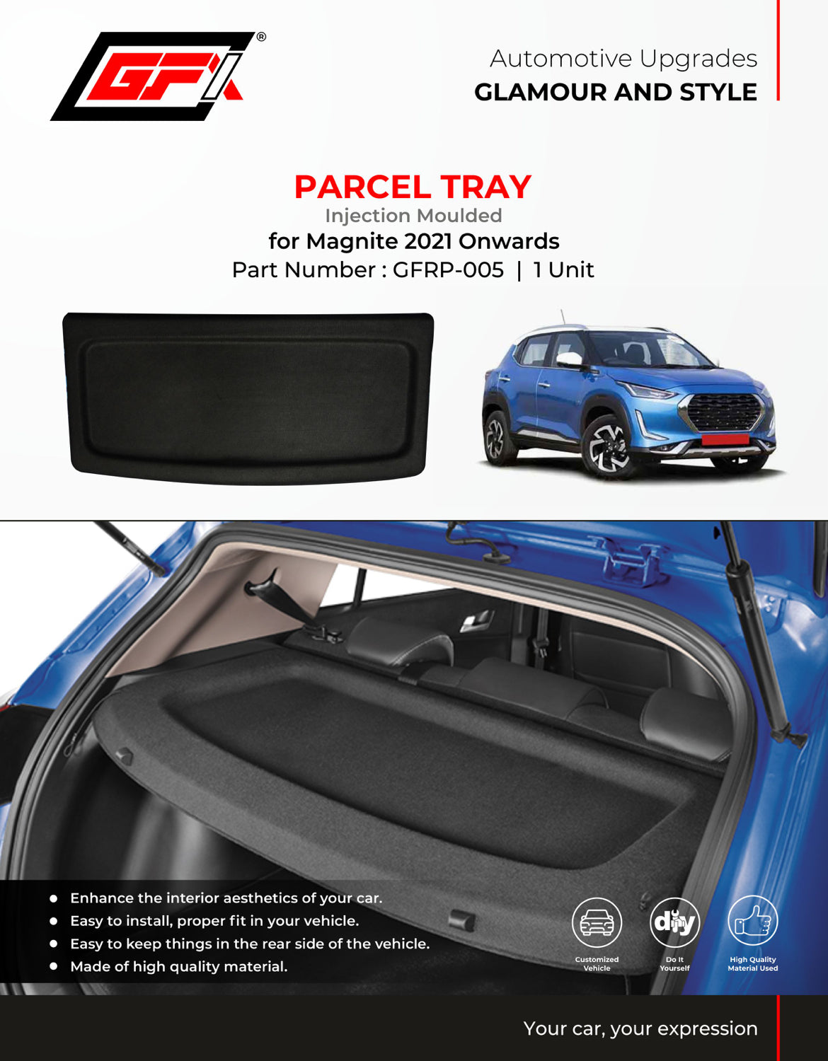 GFX Injection Moulded Parcel Tray Compatible With Nissan Magnite 2021 Onwards, 1 Unit